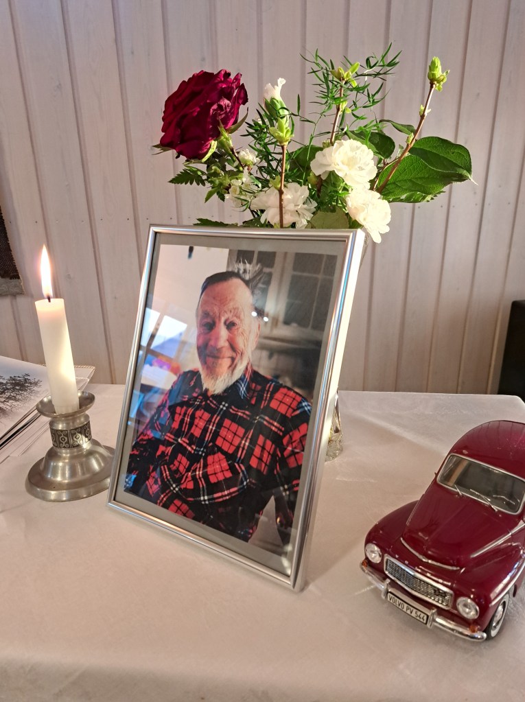 Medan vi ännu satt i kyrkans allvarsamma tystnad kunde vi höra dina fina barnbarnsbarn som pratade och skrattade, precis så där som du ville att det skulle vara när man samlas. Dina barnbarn hjälpte till på olika sätt och några av dem bar tillsammans med dina svärsöner ut kistan. Alla fanns där för dig på samma sätt som du så många gånger hjälpt och funnits där för dem. Och vet du pappa, i bänkarna satt så många människor och alla var de där för din skull. Under minnesstunden fortsatte vi på samma sätt. Vi åt tillsammans, umgicks och pratade. Så där som man gjorde förr men som vi lite tappade bort under corona-åren. Och efter att prästen hade hjälpt lilla grabben med första tårtbiten hämtade han hur mycket tårta som helst, medan allra minsta fröken gick på värsta charmoffensiven mellan borden.